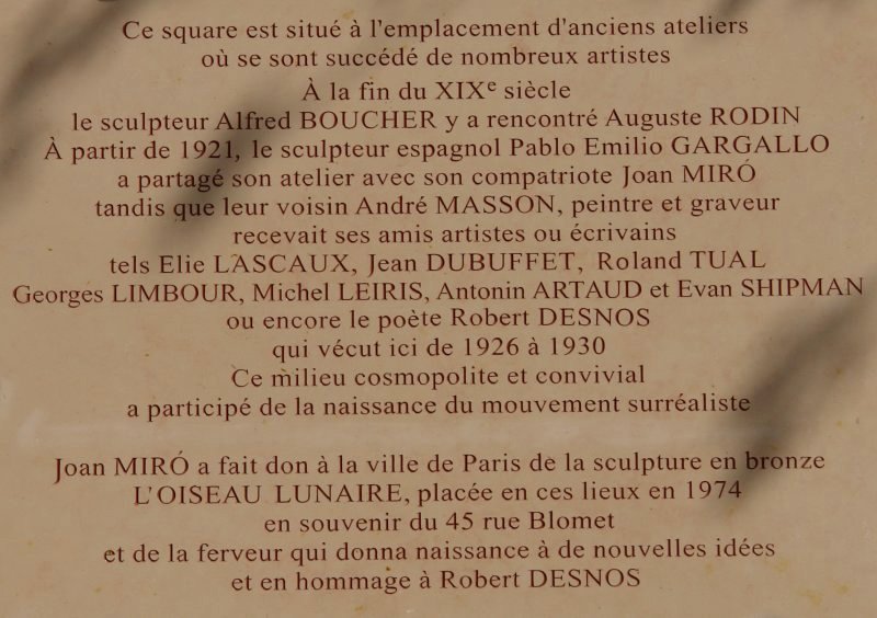 Le square de l'Oiseau Lunaire (anciennement square Blomet jusqu'en 2009) est situé rue Blomet près de la mairie du 15e arrondissement . D'une superficie de 4 200 m² il a été créé en 1969 à l’emplacement d’un immeuble où a vécu le peintre, sculpteur et céramiste Joan Miro. L’une de ses œuvres " Oiseau Lunaire", surveille les enfants qui jouent au ping-pong, dans le bac à sable ou sur l’aire de jeux sur sol souple aménagée pour eux.