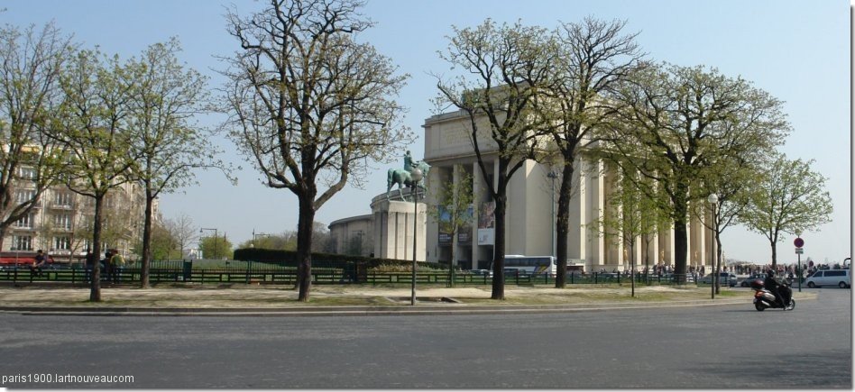 Le Palais de Chaillot, oeuvre des architectes Azema, Carlu et Boileau, est formé de deux ailes en courbe qui descendent vers la Seine a été construit pour l' Exposition Internationale des arts et techniques de 1937 , et remplace l'ancien Palais du Trocadéro dont le site a conservé le nom. L'ancienne coupole laissera la place à un parvis qui prolongera l'axe formé par le Champ de Mars et le pont d'Iéna, d'une part, et la place du Trocadéro de l'autre.
