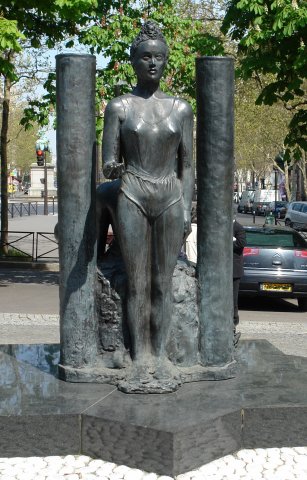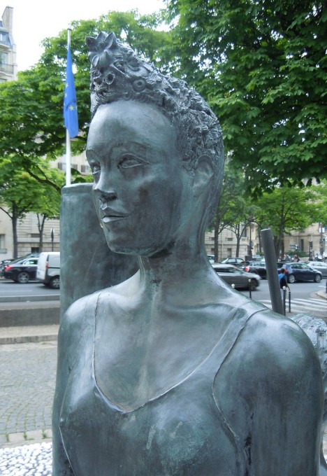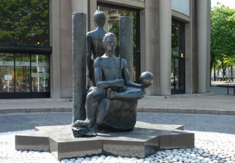 Devant l'entrée principale, une sculpture intitulée "Sol et Colombe" ou "La naissance de la Pensée" du sculpteur Martial Raysse