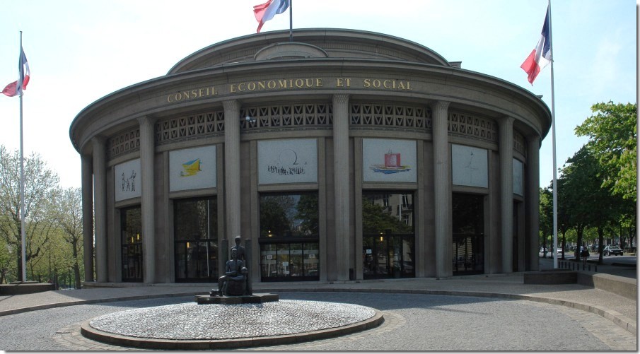 Le bâtiment a été construit, entre 1937 et 1946, par Auguste Perret, qui utilise un béton coloré et sablé permettant d'atténuer le vieillissement. Occupé initialement par l'ancien musée des Travaux publics abritant, après la Libération, l'Assemblée de l'Union française (1951-1954). Il est occupé, depuis 1959, par le Conseil économique et social. C'est la troisième assemblée prévue par la Constitution de 1958, son rôle n’est que consultative, émettant des avis sur les problèmes économiques et sociaux, elle comprend 231 membres.