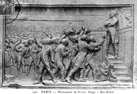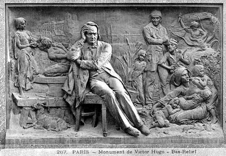 Aux pieds de Victor Hugo, la Poésie lyrique, la Poésie dramatique, l’Epopée et la Satyre. Au bas du rocher, une pieuvre évoquait ‘Les Travailleurs de la mer’, au dos un trophée militaire rappelait Waterloo. Autour du soubassement, les quatre bas-reliefs représentent Hugo poète. Descriptif des reliefs Victor Hugo au milieu de ses personnages de ses romans : Esméralda & Quasimodo ; La Flécharde et ses enfants ; Jean Valjean - Gavroche et Cosette; Gilliat et la pieuvre sculpture de Ernest Barrias Victor Hugo reçut au Parnasse par les poètes de tous les temps : Homère - Dante - Ronsart - Molière ... sculpture de André Allar Victor Hugo à la tribune de l’Assemblée Nationale sculpture de André Allar Victor Hugo souvenir de la nuit du 4 août, L’enfant avait reçu deux balles dans la tête sculpture de Ernest Barrias En 1905 des médaillons ont été ajoutés : Paul Meurice, Auguste Vacquerie, Charles Hugo et François Hugo, par les sculpteurs Jules Chaplain et Denis Puech.