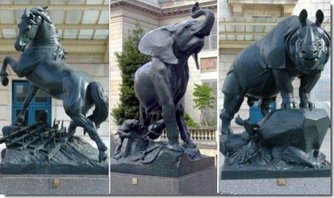 La façade de l'ancien palais du Trocadéro construit pour l'exposition universelle de 1878 et détruit en 1935 comportait de nombreuses statues en pierre. Trente statues sur la terrasse supérieure, certaines d'elle ont été déplacées dans des jardins en France. Six bronzes représentant les six continents, ils se trouvent actuellement devant l'entrée du musée d'Orsay. Au niveau des jardins du Trocadéro présence d'une fontaine avec des mascarons qui ont été déplacés dans le parc de sceaux et les jardin des serres d'Auteuil .