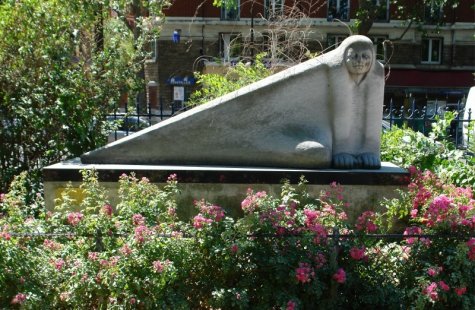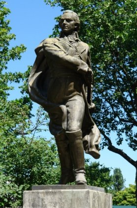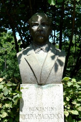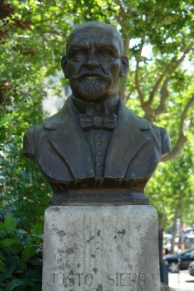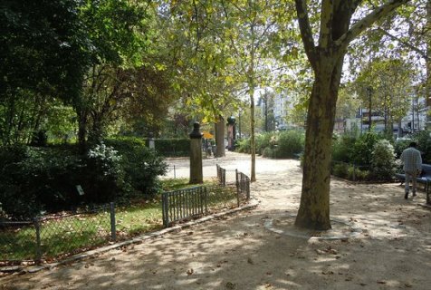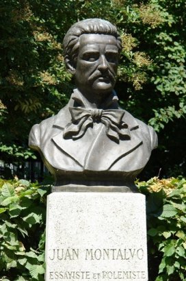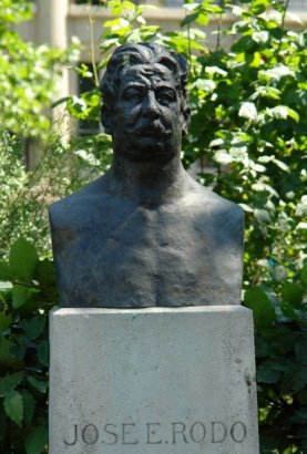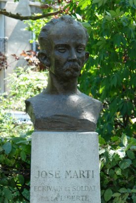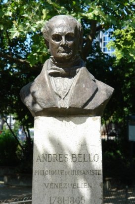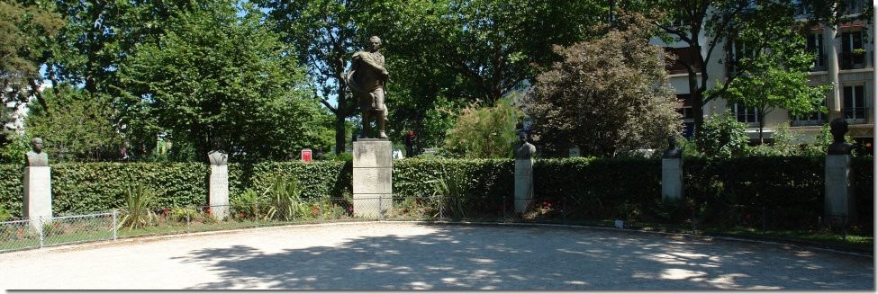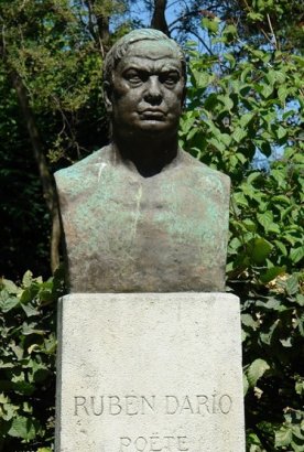 Autour de lui, formant un arc de cercle, se tiennent respectueux (de gauche à droite), Andres Bello (1781-1864), poète, philosophe, juriste et grammairien vénézuélien Juan Montalvo (1832-1889), essayiste et polémiste équatorien Ruben Dario (1867-1916), poète nicaraguayen et grand voyageur Benjamen Vicuna Mackenna (1831-1886), historien chilien Ricardo Palma (1833-1919), conteur folkloriste péruvien José E. Rodo (1871-1917), prosateur uruguayen José E. Marti (1853-1895), patriote et écrivain cubain Just Sierra (1848-1912), écrivain mexicain. Statue de Jimenez Deredia, « Poème mythique », représentant une femme couchée. Elle fut offerte par le Costa-Rica à la Ville de Paris en 1992.