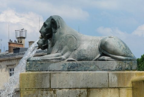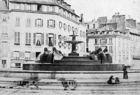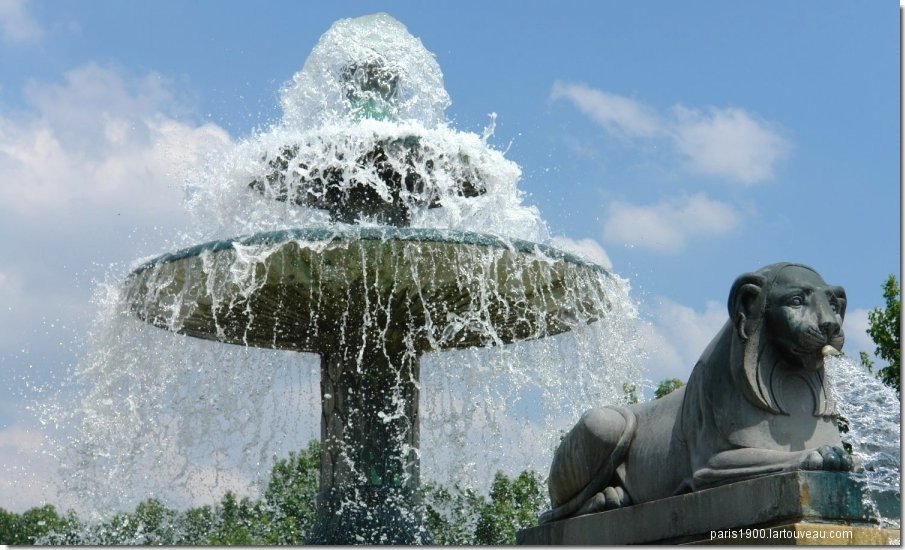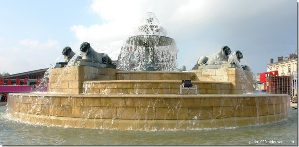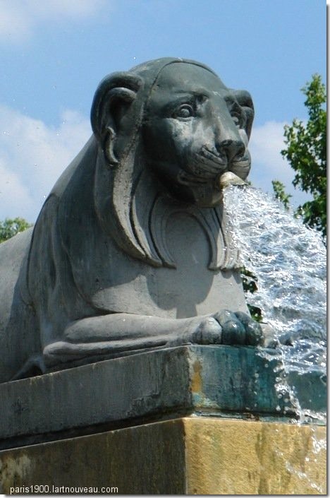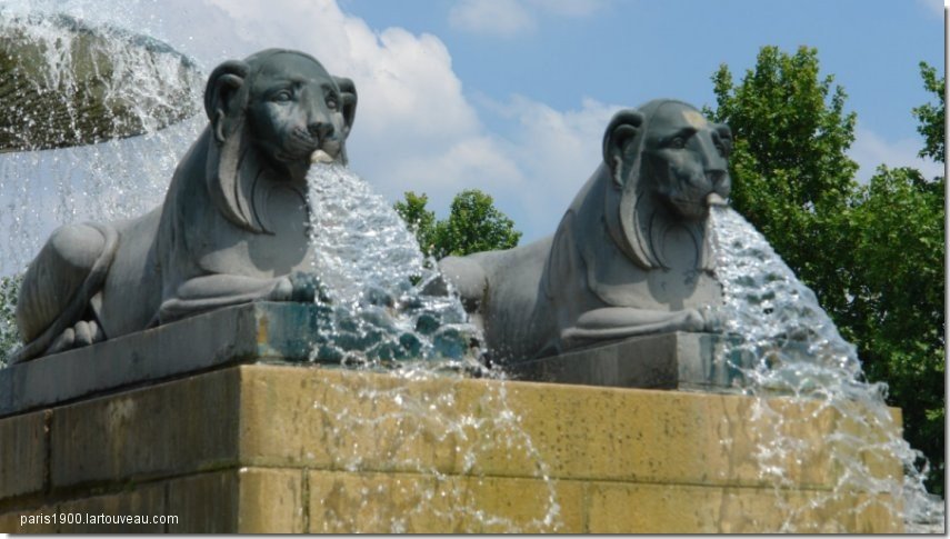 La fontaine aux lions de Nubie conçue par Girard, l'ingénieur du canal de l'Ourcq, à vasques successives, a été édifiée en 1811sur la place du château d'eau (l'actuelle place de la république). Suite à son remplacement par une autre fontaine, elle a été transférée en 1869 au marché aux bestiaux de la Villette. L'élévation du " château d'eau" est enrichie de bas-reliefs et flanquée de deux pilastres qui servent de piédestaux à des figures de lions d'où l'eau jaillit.