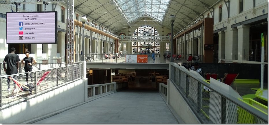 Le Centquatre, établissement artistique de la Ville de Paris, est situé en bordure des voies ferrées de la gare de l'Est , entre les rue d'Aubervilliers et la rue Curial. Ce lieu a ouvert le 11 octobre 2008 sur le site de l'ancien service municipal des pompes funèbres, au 104 rue d'Aubervilliers. Ce bâtiment avait été construit par l'archevêché de Paris en 1874 par les architectes Édouard Delebarre Debay et Godon avec la participation de Victor Baltard, architecte de la ville de Paris. En 1905, après la séparation des Églises et de l'État, les Pompes funèbres deviennent municipales.