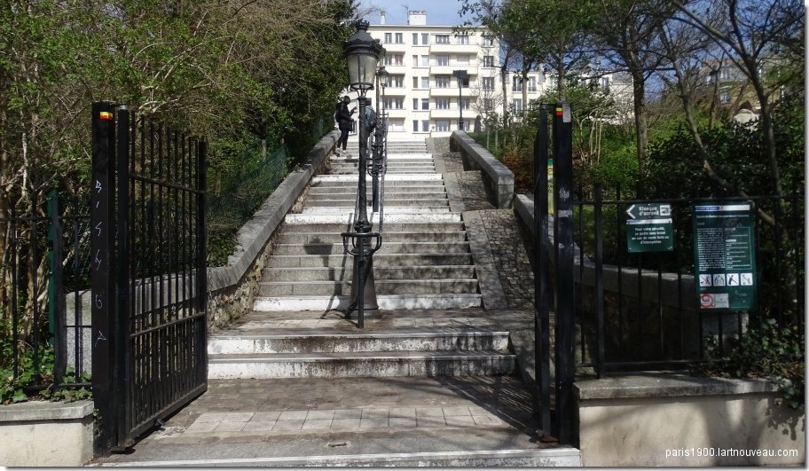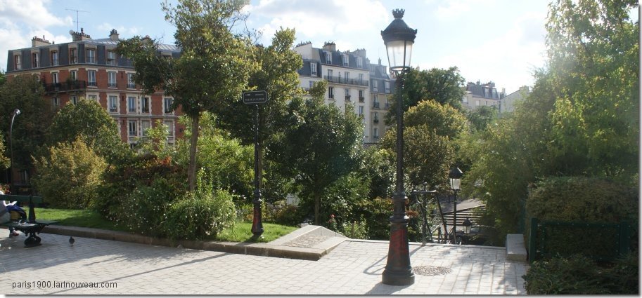La butte était autrefois occupée par des rues et des immeubles, seul l'escalier a été conservé. Le tracé des anciennes rues est matérialisé par le pavage