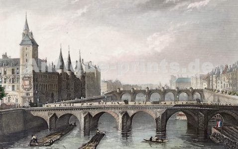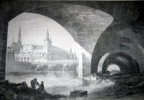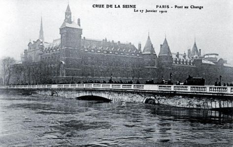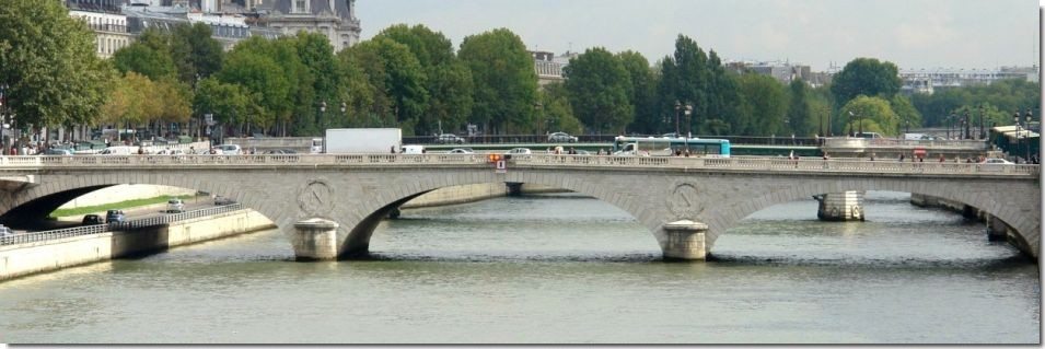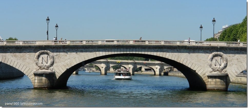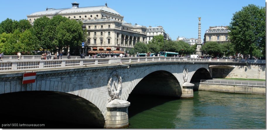 Le pont au Change relie le quai de la Mégisserie, le quai de Grèves et la place du Châtelet au quai de la Corse et quai de l'Horloge sur l'île de la Cité Les tympans portent la lettre N de Napoléon dans des couronnes de lauriers sculptées par Cabat. Le premier pont date du IXe siècle, il doit son nom aux chargeurs (joailliers et orfèvres) qui s'étaient installés en 1141 à la demande de Louis VII. Les maisons qu'il portait détruites par un incendie en 1621 ont été reconstruit avec leurs deniers de 1639 à 1647. Ce pont en maçonnerie avait 7 arches (dont 6 en Seine) et était à l'époque le plus large de la capitale; Il fut débarrassé de ses maisons en 1786. Le pont au Change, sur le grand bras de la Seine, est situé en aval du pont Notre Dame et en amont du pont Neuf