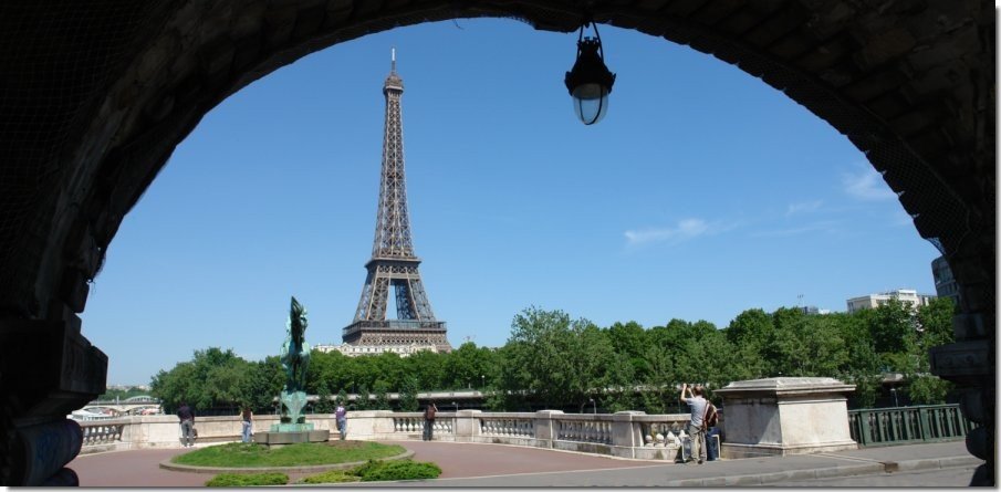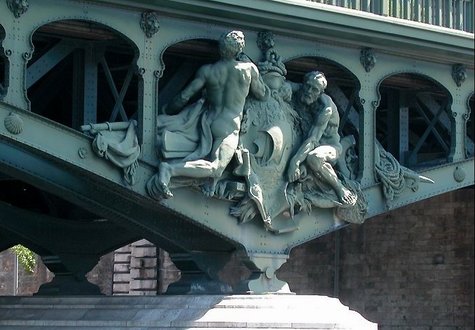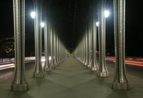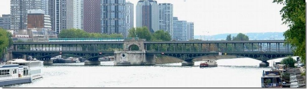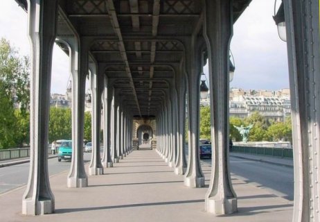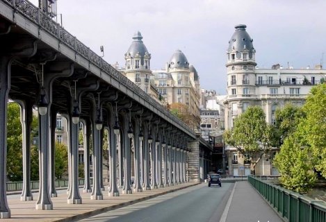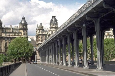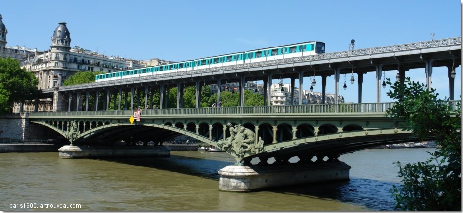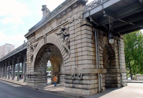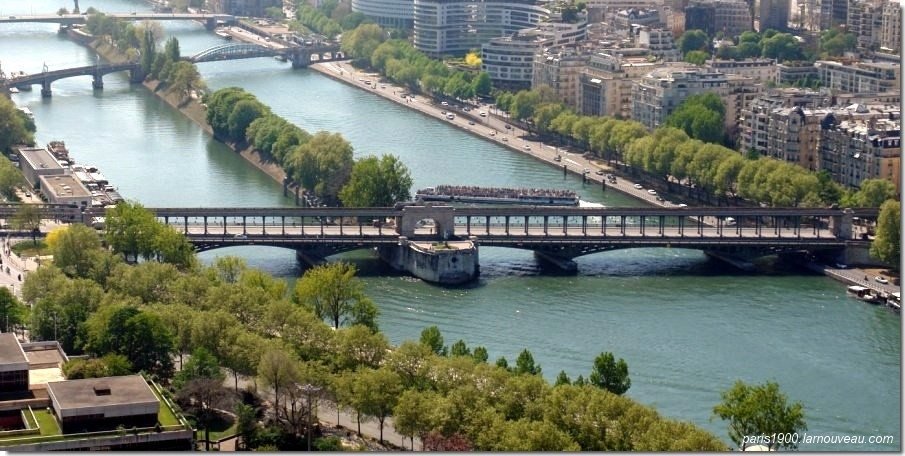 Le pont de Bir-Hakeim, anciennement viaduc de Passy, à deux niveaux, d'une longueur de 247 mètres pour une largueur de 25 m, a été construit entre 1903 et 1905 par l'ingénieur Louis Biette et l'architecte Jean-Camille Formigé. Le pont relie le quai Branly et le quai de Grenelle sur la rive gauche à l'avenue du Président Kennedy sur la rive droite après avoir traversé la pointe nord de l'île aux Cygnes.