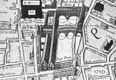 Le pont Saint-Charles reliait l'Île de la Cité à la rive gauche, entre le pont au Double et le Petit-Pont. Il a été construit, en pierre, au XVIIe siècle afin de relier les deux bâtiments de l'Hôtel-Dieu qui se situaient chacun sur une rive de la Seine. Les constructions sur le pont a subit plusieurs incendies au siècle suivant. En 1808, il est recouvert d’une galerie vitrée, mais les piles du pont faisant obstacle à la navigation sur le petit bras de la Seine.