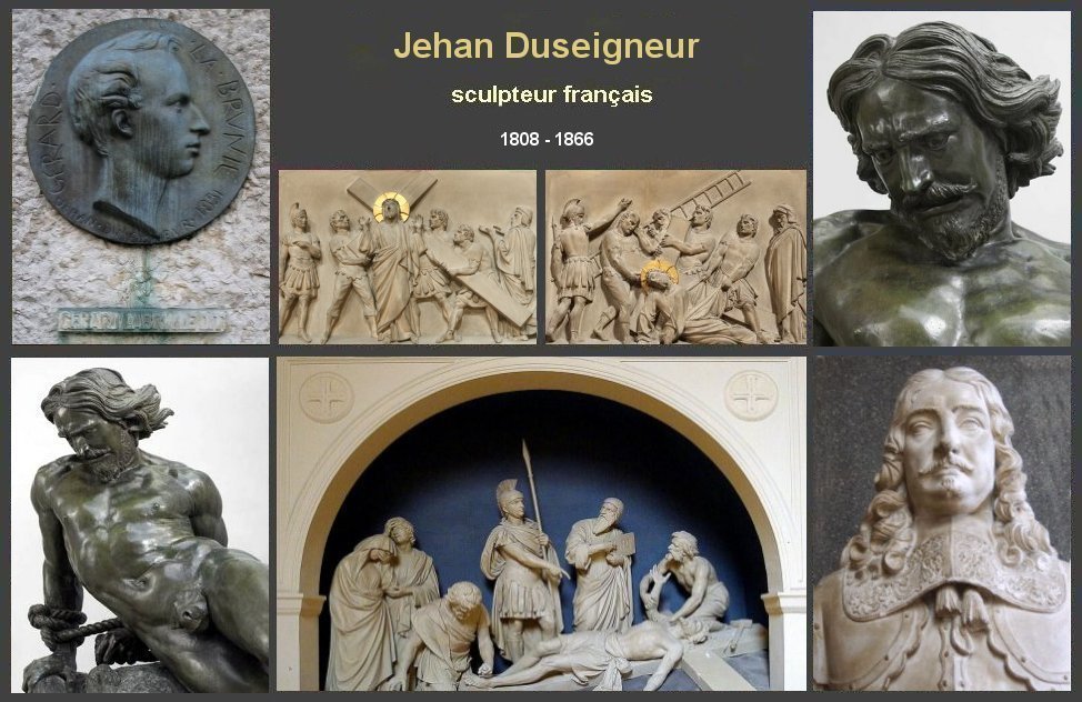 Brève biographie Jehan DuSeigneur, pseudonyme de Jean Bernard Duseigneur, sculpteur romantique français est né le 23 juin 1808 à Paris A l'âge de 14 ans il entre aux Beaux-arts et devient l'élève de François Joseph Bosio, Charles Dupaty et Jean-Pierre Cortot. Vers 1830, il déserte l'école classique, cherchant dans le Moyen Age chevaleresque et chrétien des inspirations nouvelles. Il suit avec un grand intérêt les leçons d'anatomie et montre un attrait pour les formes dictées par la nature, ce qui sera l'une des caractéristiques des romantiques Abandonnant une carrière de sculpteur romantique, DuSeigneur se tourne rapidement et presque entièrement vers l'art chrétien : production d'œuvres religieuses, décoration d'édifices religieux. Il est également un écrivain de mérite. et fréquente le Cénacle de Victor Hugo, avant d'accueillir chez lui le Petit-Cénacle, où se retrouvent des artistes tels Théophile Gautier, Gérard de Nerval, Auguste Maquet En 1842, il fonde l'Ecole Chrétienne de sculpture et devient membre et sociétaire de la Société de Saint-Jean (fondée par Lacordaire en 1839) qui voulait renouveler la pensée catholique en associant les arts et le christianisme. Jean Bernard Duseigneur est décédé le 6 mars 1866 à Paris