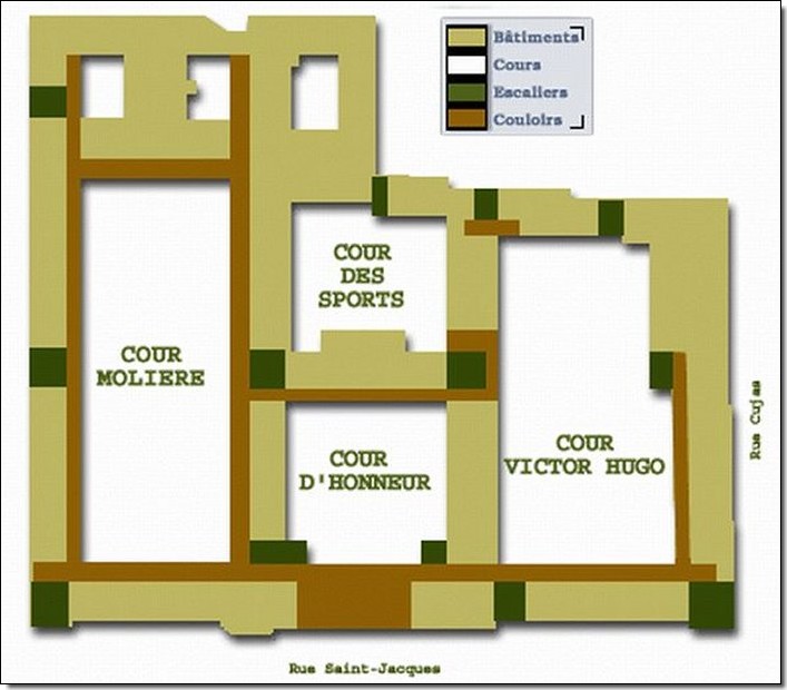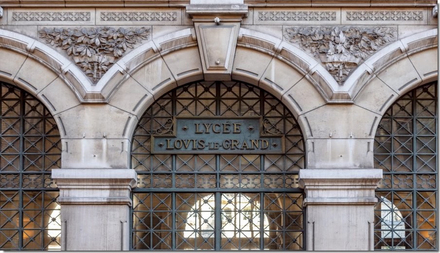Le lycée Louis le Grand, situé 123-125, rue Saint-Jacques, occupe l'espace consacré aux anciens collèges de Plessis-Sorbonne, de Clermont, des Cholets. Le collège de Plessis-Sorbonne a été fondé par Geoffroy du Plessis. En 1642, Richelieu subordonne l'établissement à la Sorbonne. Il le fait reconstruire par l’architecte Jacques Lemercier en 1649. L'entrée indique que le lycée est l'ancien collège de Clermont.Il prend le nom de collège Louis le Grand en hommage au Roi Soleil (Louis XIV).