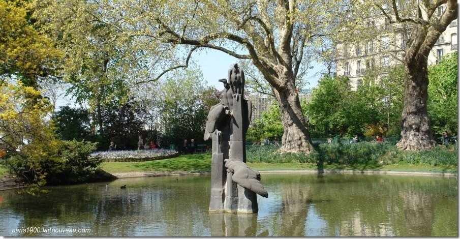 La grotte, la cascade, la rivière et le lac miniature rappellent le paysage du bois de Boulogne dessiné par certains de ses mêmes auteurs. Ce jardin à l'anglaise, légèrement vallonné comporte de magnifiques arbres, comme des platanes plantés au XIXe siècle, des féviers d'Amérique, des saules, des noisetiers de Byzance, des frênes à feuilles d'Aucuba, des plaqueminiers du Japon, des citronniers trifoliers, et un séquoia géant. La pièce d'eau comporte une sculpture en pierre noire de Volvic des " Vautours ", de Louis de Monard (1930) et un buste du poète parnassien Léon Dierx (1838-1912) par Bony de Lavergne . Des statues en bronze qui s'y trouvaient depuis la fin du XIXe siècle ont été fondues durant l'occupation en 1942.