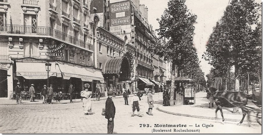 La Cigale La Cigale salle de spectacle d'une capacité d'environ 1000 places, est située 120, boulevard de Rochechouart près de la place Pigalle La salle de café-concert a été construite en 1887 à l'emplacement du Bal de la Boule noire, elle est agrandie en 1894 par l'architecte Henri Grandpierre, avec un plafond peint par Adolphe Léon Willette. Elle ferme ses portes en 1927 et est remplacé temporairement par un petit music-hall baptisé La Fourmi. Dans les années 1940, La Cigale devient une salle de cinéma. En 1987 elle réouverture de La Cigale avec les Rita Mitsouko, la salle de spectacle est modernisée et décorée par Philippe Starck.